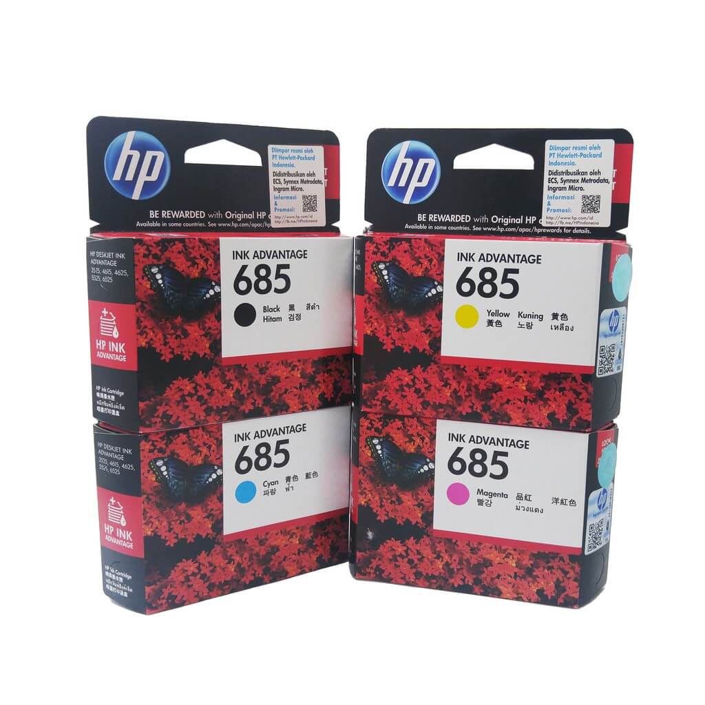 HP 685, Black, Cyan, Yellow, Magenta, Tinta HP Terbaik, Harga Terjangkau. HP Garansi RESMI, hanya di tokotintatoner.com